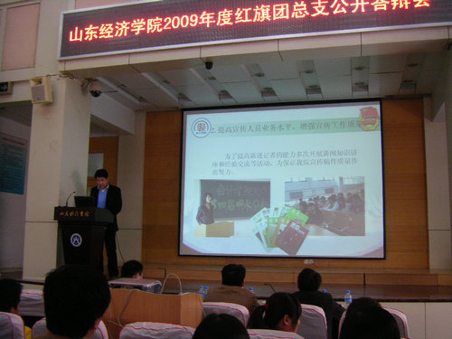 4月27日下午,公司2009年度红旗团总支公开答辩会在校本部三号报告厅举行。团省委学校部、省学联副秘书长徐加金,山东大学团委副书记傅艺娜,山东师范大学团委副书记于晓明,山东大学经济学院团委书记蔡清香和公司员工处副处长张国栋担任评委。校团委副书记张超、刘奇耀出席了答辩会。答辩会由校团委组织部长刘江宁主持。