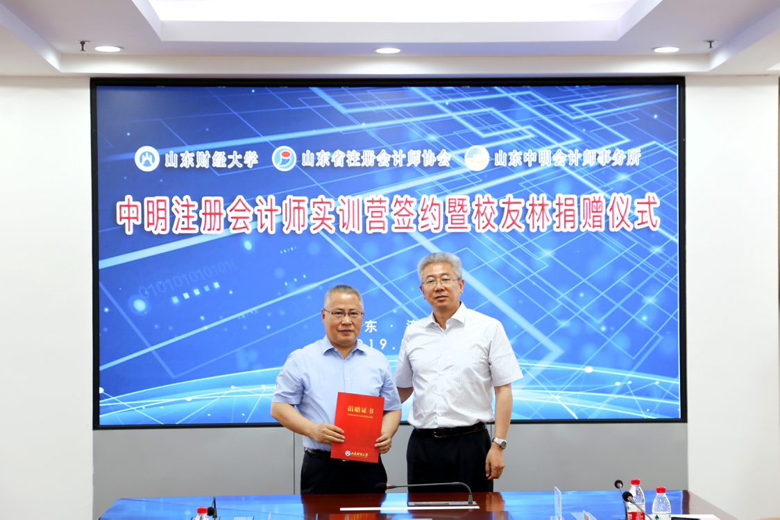 现场举办了三方签约、授旗仪式以及“中明”员工林的签约和捐赠仪式。中明会计师事务所为学校教育基金会捐赠十万元,在圣井校区建设员工林,支持母校发展。张新为巴树青颁发了捐赠证书。