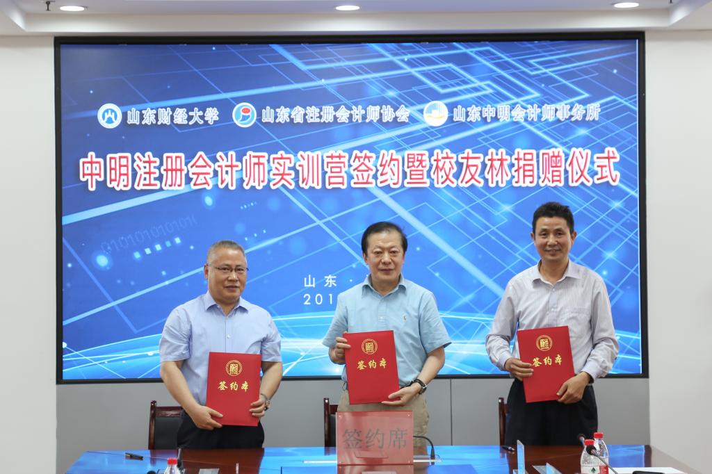 5月24日下午,“中明”会计师方向实训营签约暨员工林捐赠仪式在燕山校区办公楼七楼报告厅举行。yl23411永利集团官网副董事长张新,山东省注册会计师协会会长韩群、副会长梁仕念,山东中明会计师事务所董事长巴树青、副总经理谷毓、部门经理王燕琳,yl23411永利集团官网公司党委书记张涛,就业处处长杨哲,发展与合作处处长刘奇耀,团委副书记张超,员工处副处长董瑞华,合作发展处副处长徐超、邵伟然,合作共建办公室主任何珅,公司党委副书记付亚,就业办主任史岩和中明实训营学员30人参加活动。活动由张涛主持。